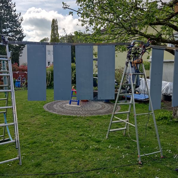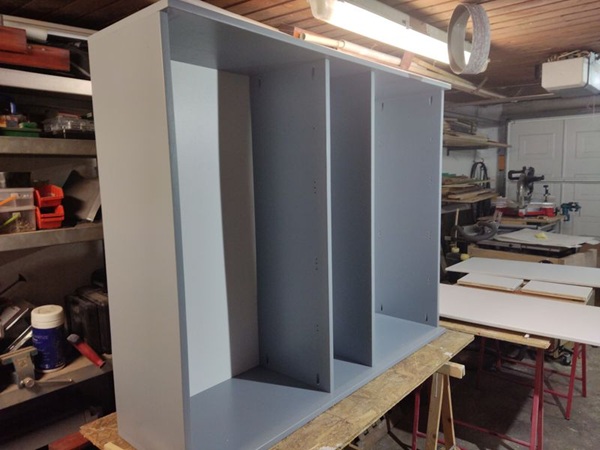 Nach dem Schleifen und fräsen der Kanten wurden ich die Einzeilteile wieder mit der Sprühpistole, die ich mir für das Gartenhaus Projekt besorgt hatte, lackiert.